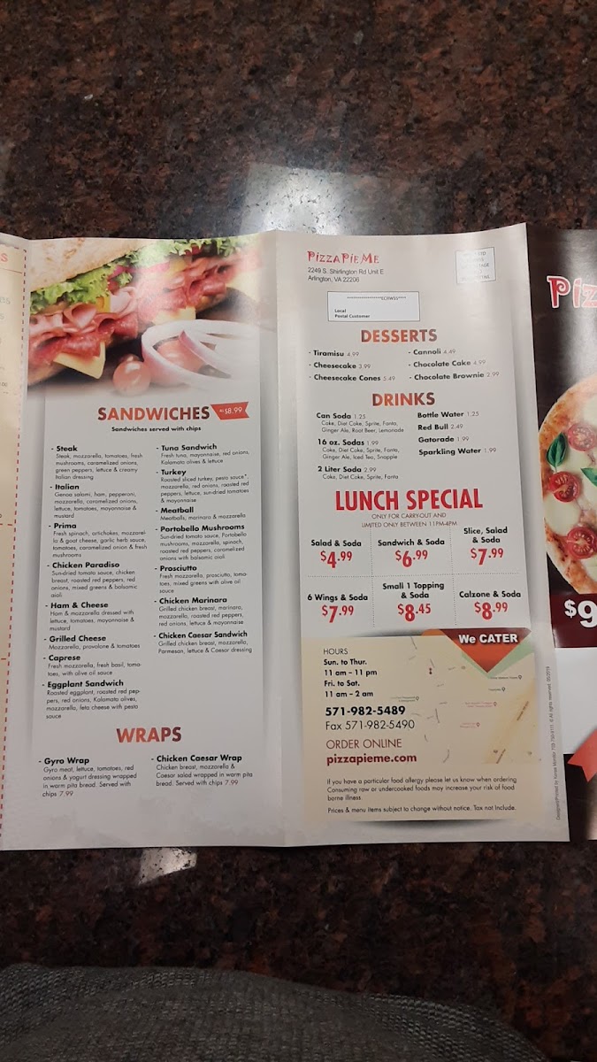 Welcome to Pizza Pie Me, a hidden gem located at 2249 Shirlington Rd, Arlington, VA, where flavor and quality unite. This charming, family-owned establishment serves up an enticing menu that includes everything from classic pizzas to distinctive offerings like their Nachos Pizza and Chicken Portabella Calzone. Customers rave about the freshness and quality of the ingredients, making each bite a delightful experience.